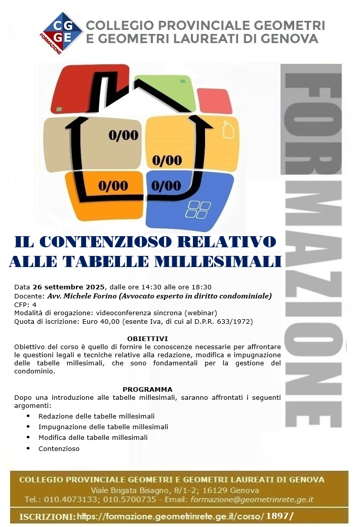 COLLEGIO GEOMETRI GENOVA - Corso webinar: "Le Tabelle Millesimali per il Condominio" - 05-12-19-26 NOVEMBRE 2025
